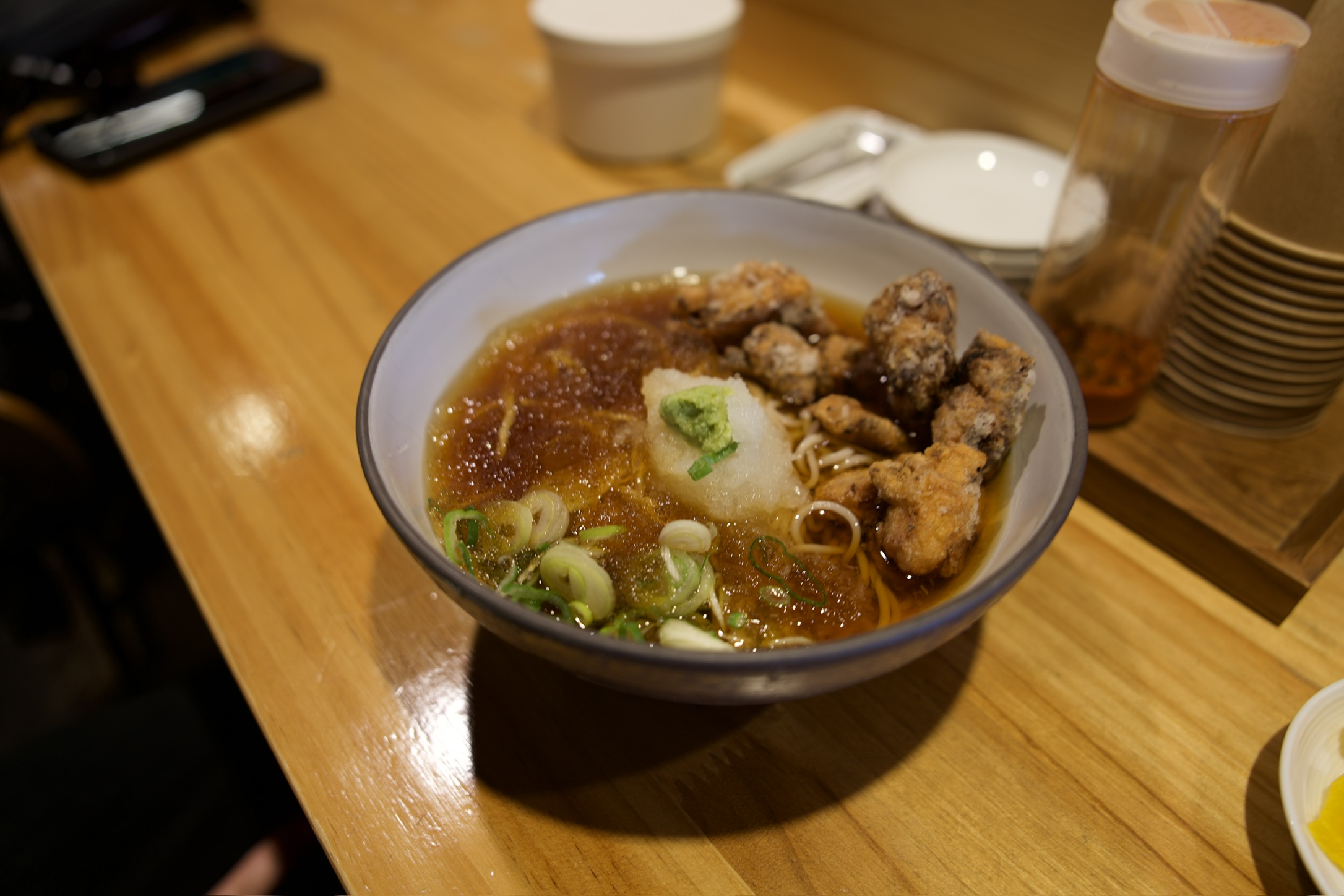 두 번째로 주문한 메뉴는 가라아게 냉소바(12,000원)입니다. 바삭하게 튀긴 닭고기 가라아게가 올라가 있어 한 끼 식사로도 든든합니다. 겉은 바삭하고 속은 촉촉해 국물과 잘 어울리고, 면과 함께 먹으면 또 다른 매력을 느낄 수 있어요. 국물은 진하지만 깔끔해 느끼하지 않고, 소바와 튀김의 조합이 훌륭했습니다. 특히 남자분들이 좋아할 법한 메뉴라는 생각이 들었어요.