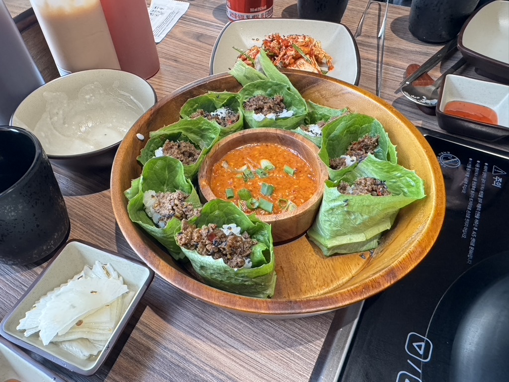 가장 많이 선택되는 메뉴는 우렁쌈밥 한우샤브(24,000원)이다. 한우는 지방 함량이 적당하고 육질이 단단하며, 끓는 점에서도 색 변화가 고르게 나타난다. 쌈 채소와 우렁 강된장은 별도 플레이팅으로 제공되어 식사의 완결성을 높인다. 또한 네이버 예약 시 제공되는 키노코 쌈밥은 메뉴 밸류를 강화하는 구성 요소로 평가된다.